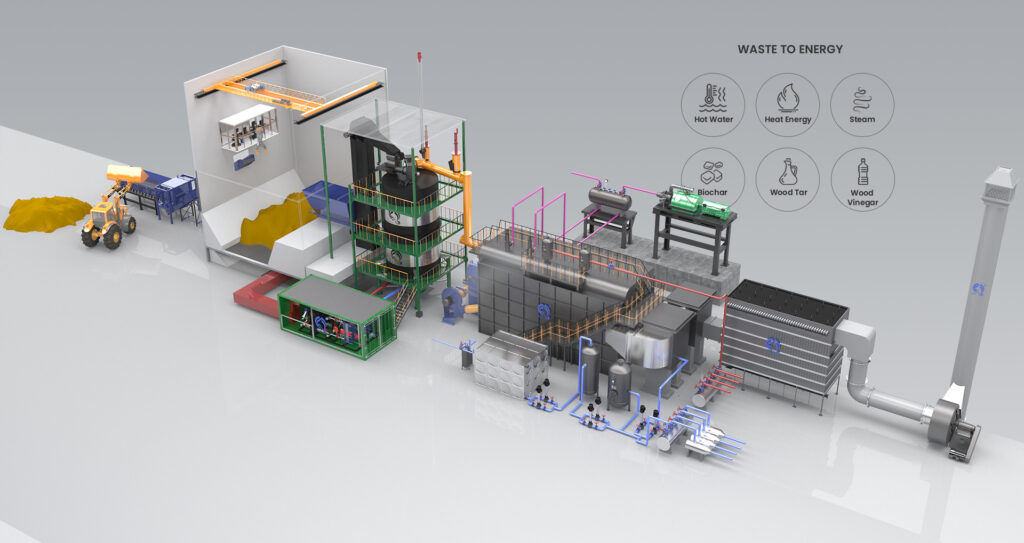 - Main energy:heat energy, electricity energy, syngas, biochar, wood vinegar, wood tar